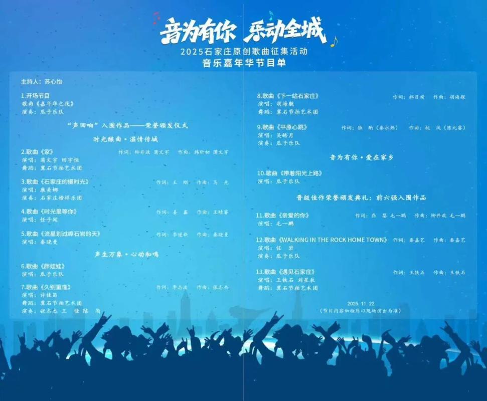 近日,由中共石家庄市委宣传部、石家庄市文化广电和旅游局联合主办的“2025石家庄原创歌曲征集活动”圆满落幕,评选结果正式揭晓。河北传媒学院音乐学院学生凭借扎实的专业功底与鲜明的创作特色脱颖而出,斩获佳绩。2022级艺术与科技专业学生秦嘉艺创作的歌曲《WALKING IN THE ROCK HOME TOWN》实力摘得“最佳歌曲奖”,2017届毕业生毛一鹏的《亲爱的你》、2024届毕业生韩昕初与蒲文宇联袂创作的《家》成功入围,并受邀在颁奖现场登台献唱原创作品,成为活动中一道亮眼的“河传风景”。