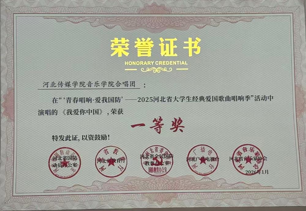近日,“青春唱响 爱我国防”2025河北省大学生经典爱国歌曲唱响季活动评选结果正式揭晓。我校音乐学院合唱团、满天星合唱团分别凭借对经典曲目《我爱你中国》的深情演绎,从全省16所高校、700余名学子中脱颖而出,均荣获一等奖。其中,音乐学院合唱团还受邀参与了现场汇演,以青春之声抒发家国情怀,为学校赢得荣誉。