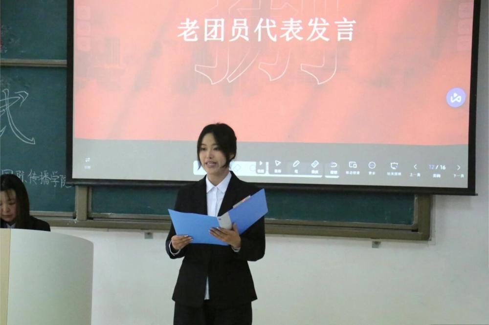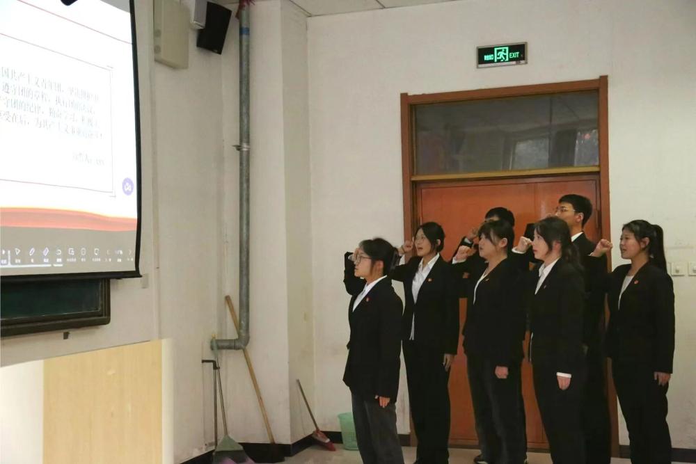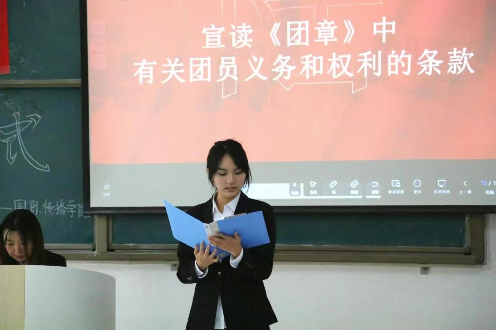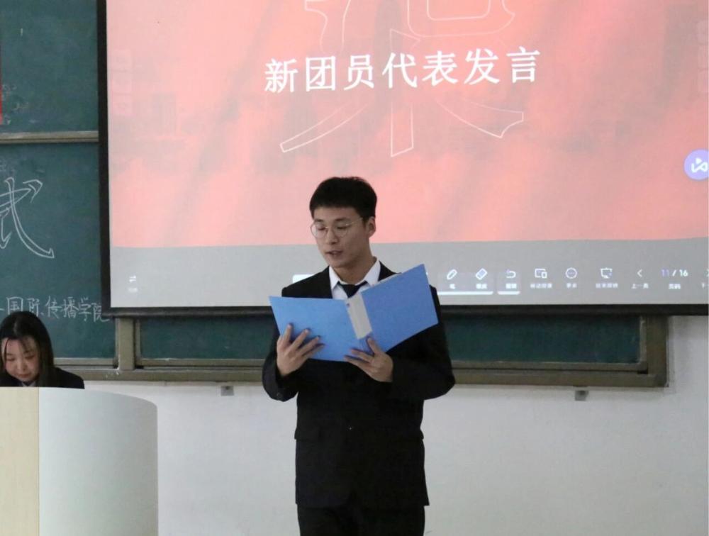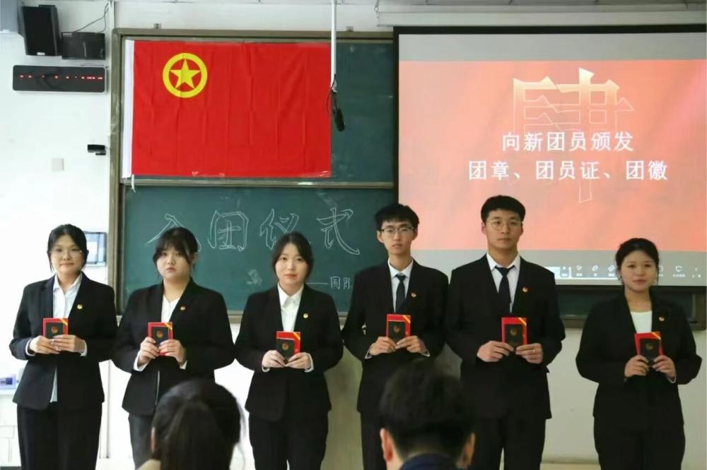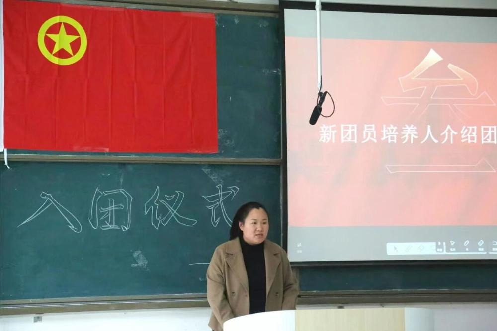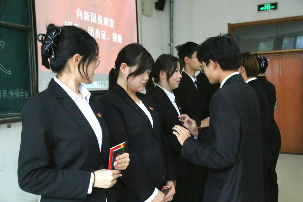仪式开始,全体师生肃立齐唱国歌。孙莹老师作为新发展团员培养人,向大家详细介绍新团员情况,随后各团支部书记为新团员颁发团章、团员证并佩戴团徽。组织部负责人王田田带领新团员在团旗下宣誓,负责人董珈悦宣读团员权责。新老团员代表陈麒烨、韦欣妍表示会不断提高思想觉悟,严格要求自己。