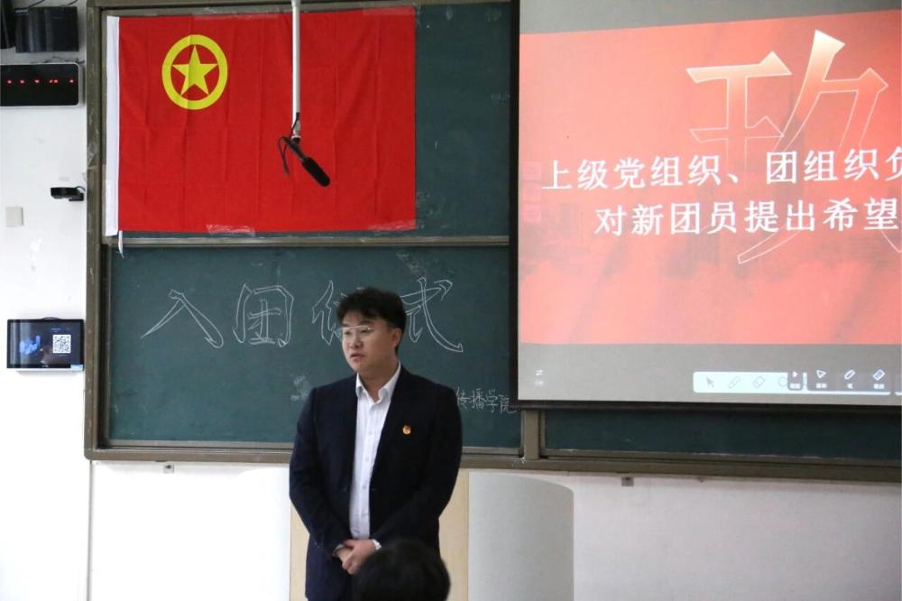 王天庆老师对新入团的同学表示祝贺,希望大家在学习和生活中团结奋进,锐意进取,做好学生榜样。最后,全体参会人员奏唱团歌,入团仪式到此结束。
