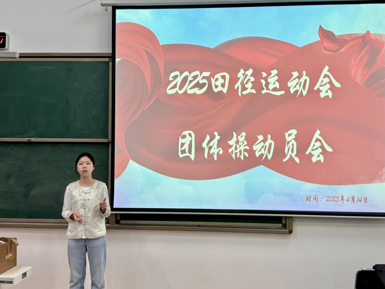 为迎接学校新一轮教育教学审核评估,鼓励同学们积极参与团体操训练,做好2025年田径运动会开幕式的准备。4月14日,我院辅导员郝梦梦于鹿泉校区1-301教室召开2025年田径运动会团体操运动员动员会。