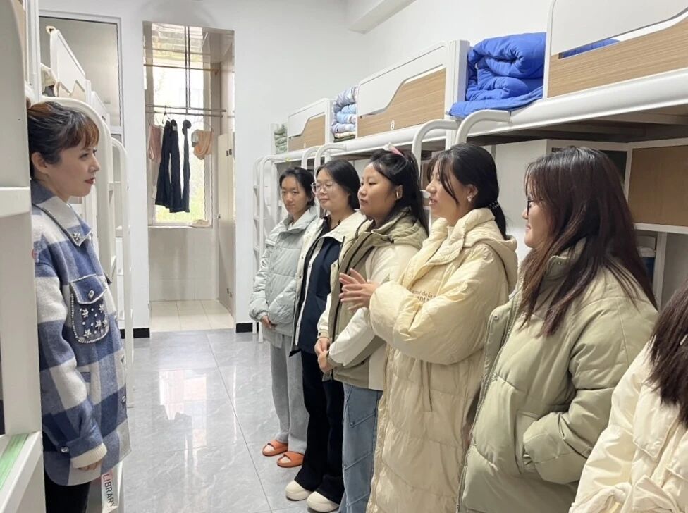 在教学区,杨菲书记密切关注学生的课堂表现与课前准备状态,并与同学们亲切交流,鼓励大家保持积极向上的学习风貌。在宿舍区,她仔细检查宿舍卫生与环境情况,耐心询问学生日常生活状况,认真听取同学们的意见,并就存在的问题提出改进建议。